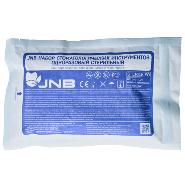 JNB Набор инструментов стерильный одноразовый. Свойства • Набор стоматологических инструментов одноразовый стерильный предназначен для проведения первичных стоматологических приёмов, массовых первичных