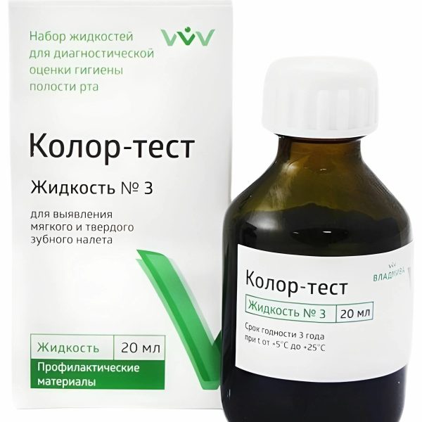 «КОЛОР-ТЕСТ №3» — предназначен для выявления мягкого и твердого зубного налета и оценки гигиены полости рта врачом или самостоятельно пациентом