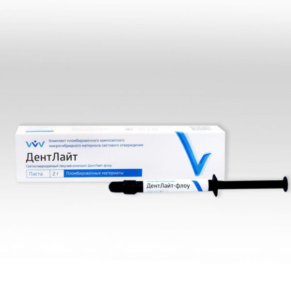 Текучий композитный материал «ДентЛайт» флоу представляет собой низковязкую светоотверждаемую пасту на основе метакрилатных олигомеров и модифицированного тонкодисперсного нанонаполнителя. Материал совместим
