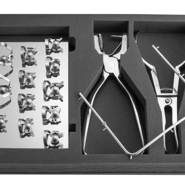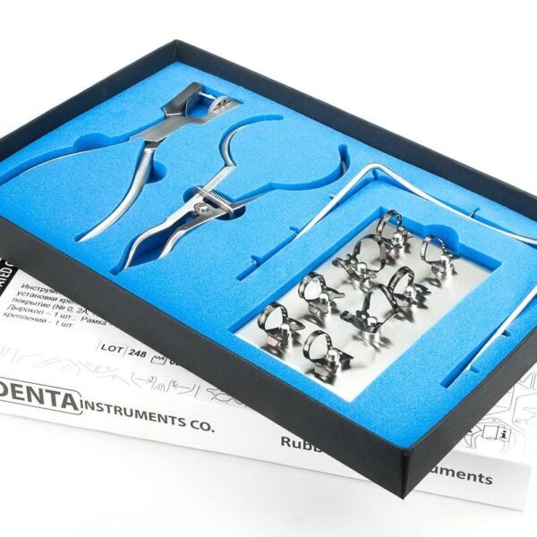 Комплект инструментов и принадлежностей для наложения резиновой завесы Раббер Дам Медента состоит из щипцов для наложения креплений, перфоратора-дырокола, стальных креплений
