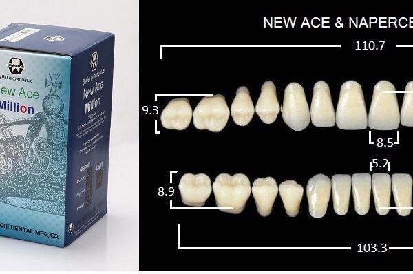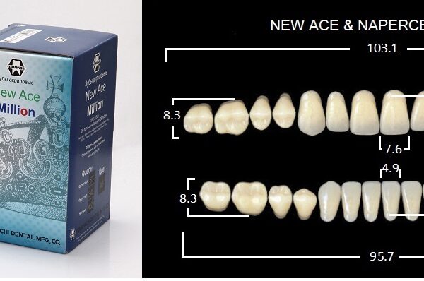 Зубы акриловые, 20 полных гарнитуров в боксе: фронтальные двухслойные New Ace верх фасон T1 — 120 шт.; низ фасон L2
