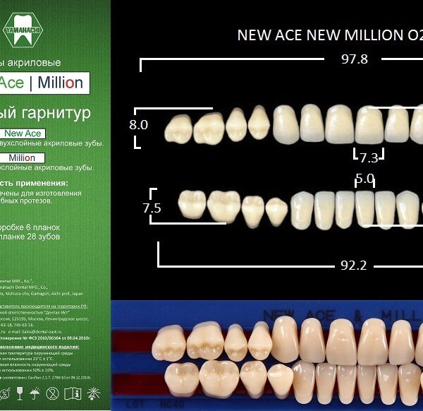 Зубы акриловые, 20 полных гарнитуров в боксе: фронтальные двухслойные New Ace верх фасон O2 — 120 шт.; низ фасон S3L