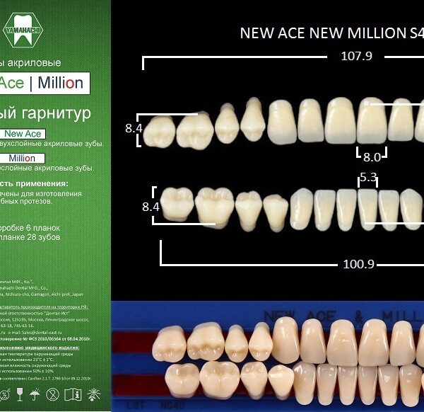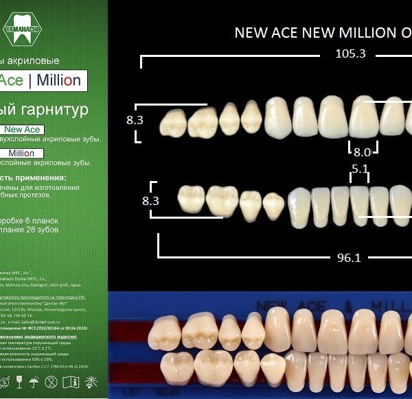 Зубы акриловые, 20 полных гарнитуров в боксе: фронтальные двухслойные New Ace верх фасон TL4 — 120 шт.; низ фасон L6