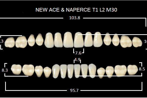 Зубы акриловые двухслойные, полный гарнитур, 28шт. Gloria цвет. B1, Фронтальные-T2, боковые-М30