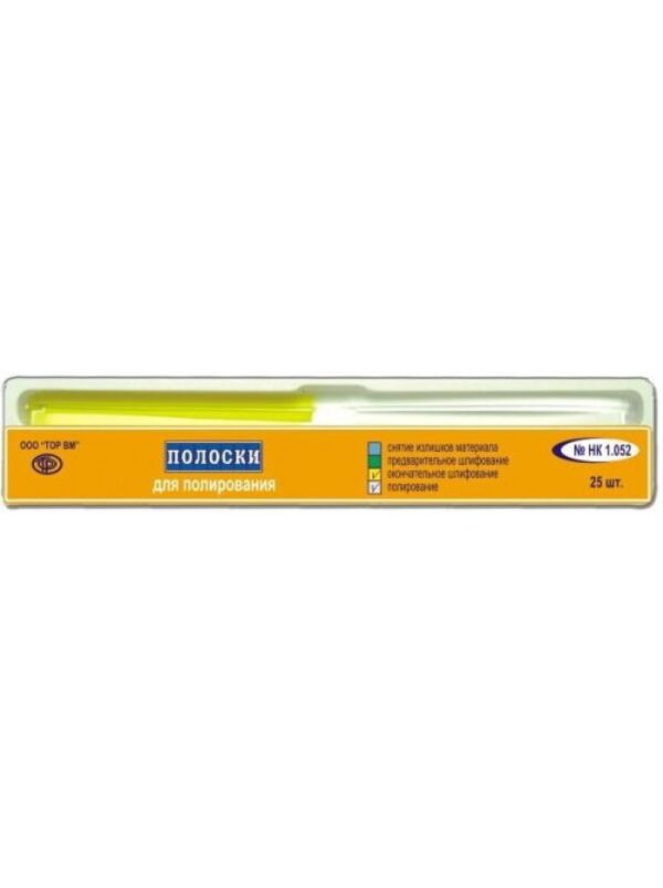 Полоски для полирования, шлифовальные на лавсановой основе предназначены для шлифования и полирования труднодоступных поверхностей зуба при обработке пломб из композитных материалов. Полоска состоит из 2-х участков с различными абразивными слоями. С абразивностью 20 мкм желтого цвета и 5 мкм белого цвета. Упаковка 25 шт.