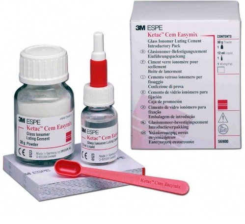 Набор Ketac-Cem Easymix – стеклоиономерный цемент для фиксации. Показания к применению: • Постоянная фиксация вкладок, накладок, коронок, мостовидных протезов из