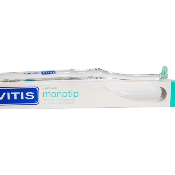 Vitis Monotip — монопучковая зубная щетка от испанского производителя. Подходит для чистки съемных и несъемных ортопедических конструкций, установленных в ротовой