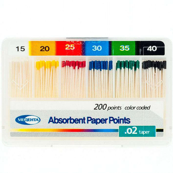 Штифты бумажные абсорбирующие — предназначены для высушивания корневых каналов. Изготовлены из бумаги высокой абсорбирующей способности. Преимущества: * Натуральные — не содержат примесей связующих веществ * Идеальной плотности для введения в каналы без дополнительного скручивания и сгибания * Сохраняют форму при извлечении из канала. * Стерильны * Легкая идентификация — цветокодированы в верхней части штифта * Абсолютное соответствие размера стандарту ISO * Имеют все международные сертификаты ведущих стран мира.