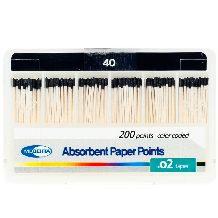 Штифты бумажные абсорбирующие — предназначены для высушивания корневых каналов. Изготовлены из бумаги высокой абсорбирующей способности. Преимущества: * Натуральные — не содержат примесей связующих веществ * Идеальной плотности для введения в каналы без дополнительного скручивания и сгибания * Сохраняют форму при извлечении из канала. * Стерильны * Легкая идентификация — цветокодированы в верхней части штифта * Абсолютное соответствие размера стандарту ISO * Имеют все международные сертификаты ведущих стран мира.