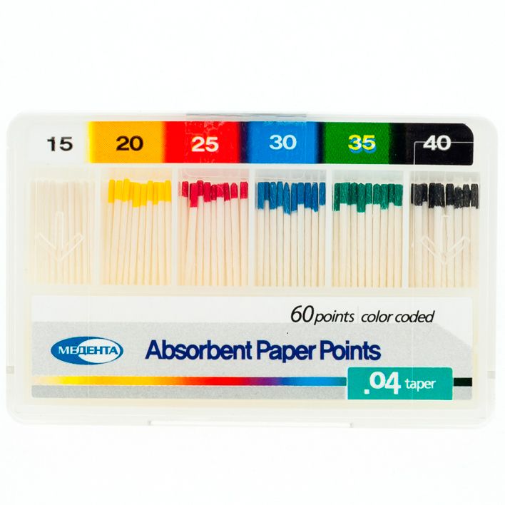 Штифты бумажные абсорбирующие — предназначены для высушивания корневых каналов. Изготовлены из бумаги высокой абсорбирующей способности. Преимущества: * Натуральные — не содержат примесей связующих веществ * Идеальной плотности для введения в каналы без дополнительного скручивания и сгибания * Сохраняют форму при извлечении из канала. * Стерильны * Легкая идентификация — цветокодированы в верхней части штифта * Абсолютное соответствие размера стандарту ISO * Имеют все международные сертификаты ведущих стран мира.