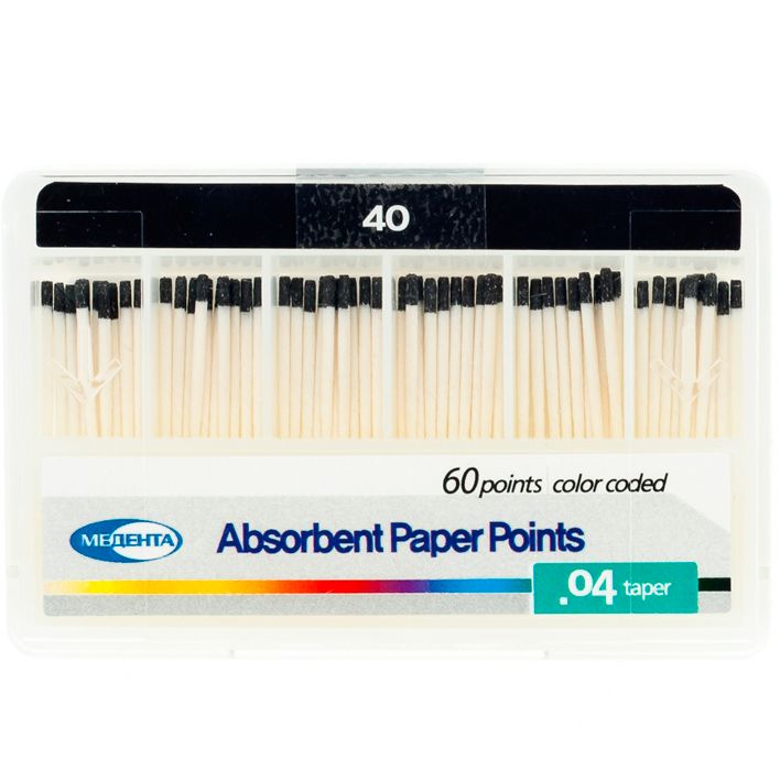 Штифты бумажные абсорбирующие — предназначены для высушивания корневых каналов. Изготовлены из бумаги высокой абсорбирующей способности. Преимущества: * Натуральные — не содержат примесей связующих веществ * Идеальной плотности для введения в каналы без дополнительного скручивания и сгибания * Сохраняют форму при извлечении из канала. * Стерильны * Легкая идентификация — цветокодированы в верхней части штифта * Абсолютное соответствие размера стандарту ISO * Имеют все международные сертификаты ведущих стран мира.