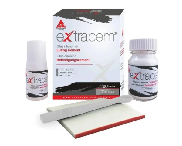 Extra Cem (Экстра Цем) от производителя President Dental – это рентгеноконтрастный стеклоиономерный цемент с длительным рабочим временем с последующей реакцией на схватывание. Сочетает в себе отличную управляемость. Цемент имеет очень малую толщину пленки и превосходные рабочие свойства – он легко замешивается и обладает удобным временем отверждения. В состав цемента входит фтор, который эффективно предотвращает развитие заболеваний под металлическими конструкциями. Extra Cem идеален для постоянного цементирования металлических каркасов, мостов, вкладок и ортодонтических конструкций.
