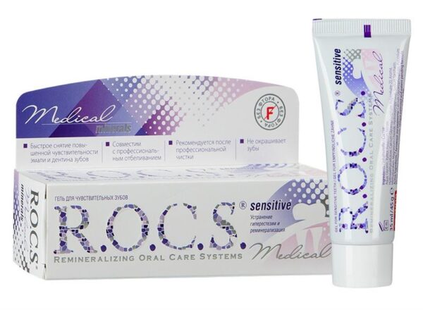 Гель R.O.C.S. Medical Sensitive позволяет быстро снять болевые симптомы / предотвратить их возникновение и одновременно осуществить реминерализацию твердых тканей зубов (эмали и дентина).