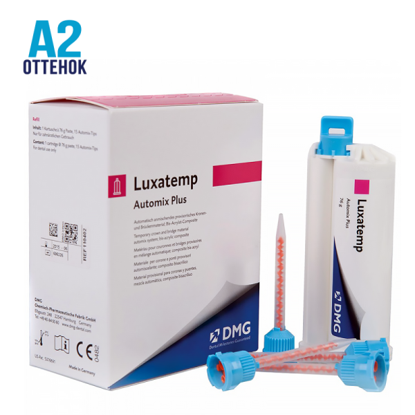 Luxatemp — Automix Plus в оттенке A2 — самополимеризующийся композит для изготовления временных коронок и мостов, вкладок, накладок и виниров.