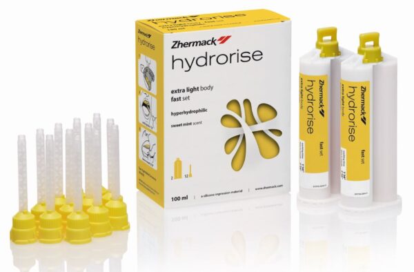 Жёлтого цвета, аромат сладкой мяты. Упаковка: 2 x 50 мл картриджа (База + Катализатор) + 12 шт. жёлтых смесительных наконечников. Hydrorise Extra Light Body Normal Set — гипергидросовместимый А-силикон очень низкой вязкости. Применение: Несъёмные протезы. Корригирующий слой для двухэтапной техники оттиска или одновременной техники с материалами разной степени вязкости. Преимущества: • Максимальная точность в воспроизведении деталей • Повышенная прочность на разрыв • Превосходное упругое восстановление • Повышенная стабильность размеров • Не рвется в области ярко выраженных поднутрений • Не стекает с препарируемого участка • Технология гипергидрофильности увеличивает гидросовместимость силикона и улучшает конечное качество оттиска • Возможность немедленной отливки модели Характеристики: • Пропорция при смешивании 1:1 • Высочайшая совместимость с водой (гипергидросовместимость) • Идеальное соотношение между временем обработки/затвердевания (эффект Snap-set): o Длительное время обработки o Минимальное время пребывания в полости рта • Биосовместимость • Тиксотропия • Максимальная точность в воспроизведении деталей Технические данные: • ISO 4823 — ADA 19 — Тип 3 Текучая консистенция • Соотношение при замешивании База/Катализатор — 1:1 • Общее время обработки (23°C/73°F) — 2′ 00» • Пребывание в полости рта — 3′ 30» • Время схватывания (23°C/73°F) — 5′ 30» • Деформация при сжатии (мин — макс) — 3 — 5 % • Упругое восстановление > 99.5 % • Стабильность размеров (через сутки) < -0.20 % • Твердость (По Шору А) 45 ± 2