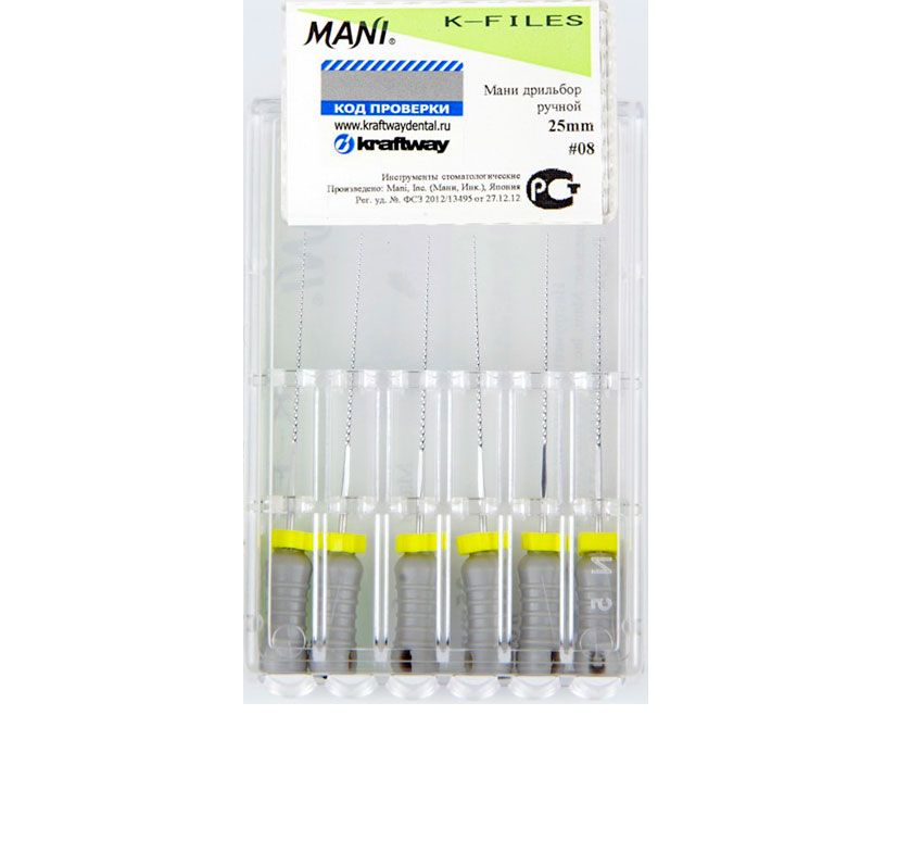 Применяется как для прохождения, так и для расширения корневых каналов, в том числе сильно искривлённых. Упаковка: 6 штук одной длины 25 мм, размер 08. Mani K-Files. Мани дрильбор ручной, бурав Керра (каналорасширитель). Необыкновенно острые и заточенные до зеркального блеска режущие поверхности, обладающие при этом высокой эластичностью, гарантируют отличные рабочие характеристики инструмента. Гибкий файл с мелким шагом режущих граней. Оригинальная нержавеющая сталь MANI 18-8 с прочным волокном предотвращает возникновение коррозии после повторной чистки и стерилизации. ТЕХНИКА ПРИМЕНЕНИЯ: Обработка канала производится движением инструмента в вертикальном направлении «вверх» — «вниз» (пилящие движения). При введении допускаются вращательные движения на 90° по или против часовой стрелки, позволяющие инструменту продвигаться вперёд. • Номерная идентификация. Четко прописанные номера, на верхней части рукоятки, делают процесс идентификации размера инструмента легким, когда их кладут в коробку для хранения. • Для предотвращения падения инструмента во время эксплуатации, в дизайне предусмотрено отверстие для фиксации ниткой или цепочкой. • Цветовая маркировка. Размер диаметра римеров соответствует соответствующему цвету рукоятки. • Ребристая рукоятка инструмента делает его удобным в применении и предотвращает выскальзывание во время эксплуатации. • Эргономическая рукоятка инструмента обеспечивает комфорт в применении. • Резиновые стопперы устанавливаются в соответствии с формой и размером конкретного инструмента. • Безупречные режущие поверхности, острые и заточенные до зеркального блеска режущие поверхности. • Конусность 2/100 в соответствии со стандартами ISO. • Упаковка позволяет определить форму, длину и размер изделия без распаковки. Стерилизация: Эндодонтические инструменты фирмы MANI без потери качества выдерживают стерилизацию любым методом (автоклавирование, химическая стерилизация, сухожаровая стерилизация до 2000С).
