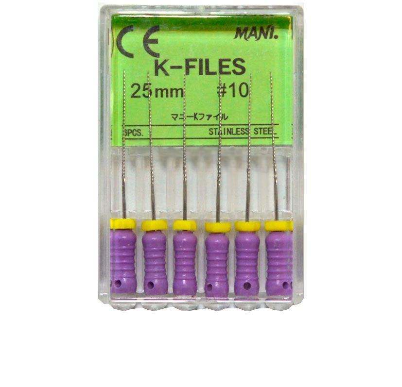 Ручной инструмент для расширения корневого канала. K-File изготовлены из высококачественной хромоникелевой стали. Упаковка: 6 штук.