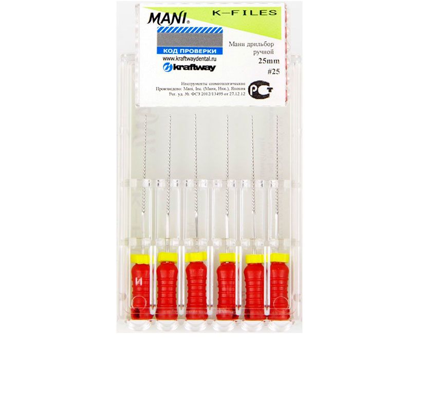 Применяется как для прохождения, так и для расширения корневых каналов, в том числе сильно искривлённых. Упаковка: 6 штук одной длины 25 мм, размер 25. Mani K-Files. Мани дрильбор ручной, бурав Керра (каналорасширитель). Необыкновенно острые и заточенные до зеркального блеска режущие поверхности, обладающие при этом высокой эластичностью, гарантируют отличные рабочие характеристики инструмента. Гибкий файл с мелким шагом режущих граней. Оригинальная нержавеющая сталь MANI 18-8 с прочным волокном предотвращает возникновение коррозии после повторной чистки и стерилизации. ТЕХНИКА ПРИМЕНЕНИЯ: Обработка канала производится движением инструмента в вертикальном направлении «вверх» — «вниз» (пилящие движения). При введении допускаются вращательные движения на 90° по или против часовой стрелки, позволяющие инструменту продвигаться вперёд. • Номерная идентификация. Четко прописанные номера, на верхней части рукоятки, делают процесс идентификации размера инструмента легким, когда их кладут в коробку для хранения. • Для предотвращения падения инструмента во время эксплуатации, в дизайне предусмотрено отверстие для фиксации ниткой или цепочкой. • Цветовая маркировка. Размер диаметра римеров соответствует соответствующему цвету рукоятки. • Ребристая рукоятка инструмента делает его удобным в применении и предотвращает выскальзывание во время эксплуатации. • Эргономическая рукоятка инструмента обеспечивает комфорт в применении. • Резиновые стопперы устанавливаются в соответствии с формой и размером конкретного инструмента. • Безупречные режущие поверхности, острые и заточенные до зеркального блеска режущие поверхности. • Конусность 2/100 в соответствии со стандартами ISO. • Упаковка позволяет определить форму, длину и размер изделия без распаковки. Стерилизация: Эндодонтические инструменты фирмы MANI без потери качества выдерживают стерилизацию любым методом (автоклавирование, химическая стерилизация, сухожаровая стерилизация до 2000С).