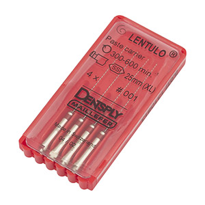 Каналонаполнители машинные Lentulo (Лентуло) предназначены для заполнения канала пастой, цементом или силером, для угловых наконечников (RA). Представляет собой спираль конической формы из нержавеющей стали. В зависимости от длины рабочей части различают: короткие спирали — 17 мм, длинные спирали — 21 мм, очень длинные спирали — 25 мм. Кроме того, в каждую группу входят 4 различных по толщине спирали. Важно, чтобы размер каналонаполнителя соответствовал размерам Римера и Файла. После обработки каналов инструментами 030, 035 пользуются каналонаполнителем №1 (красное кольцо), После обработки инструментами 040, 045 — каналонаполнителем №2 (синее кольцо). После обработки 050, 055, 060 — каналонаполнителем №3 (зеленое кольцо). После обработки 070, 080, 090 — №4 (черное кольцо). Оптимальная скорость при работе машинным каналонаполнителем 100-200 об/мин (не реколмендуется превышать 500 об/мин).