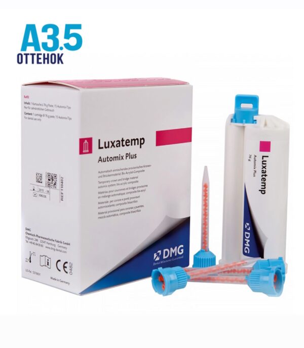 Luxatemp — Automix Plus в оттенке A3.5 — самополимеризующийся композит для изготовления временных коронок и мостов, вкладок, накладок и виниров. Это двухкомпонентный материал автоматического смешивания на основе мультифункциональных метакрилатов. В комплект поставки входит 1 картридж (76 гр.) в оттенке А3 + 15 насадок Automix-Tip.