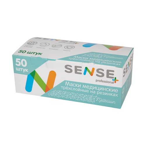 Маски медицинские одноразовые SENSE, трехслойные, на резинках. Изготовлены из высококачественного синтетического нетканого материала. Снабжены антибактериальным фильтром, препятствующим миграции бактерий и проникновению биологических жидкостей. Гибкий носовой фиксатор в верхней части маски обеспечивает подбор индивидуальной формы, лучшее прилегание к лицу и защиту. Тактильные ощущения аналогичные хлопку обеспечивают комфорт, а высокая степень фильтрации – безопасность.
