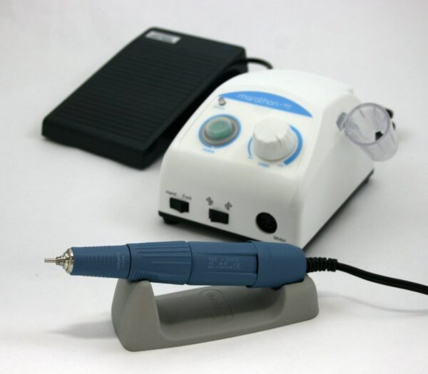 Микромотор зуботехнический в комплекте: блок управления для аппарата шлифовального зуботехнического, марки «Marathon», Marathon N7 (эл. мощность 100Вт) с пластиковым держателем наконечника (SMT-HSEN) и подставкой, наконечник-микромотор SDE-SH37L М 45 (40000 об/мин, вращающий момент 4,5 Н*см), педаль FS60 плавного регулирования скорости и техпаспорт, SMT (Корея)