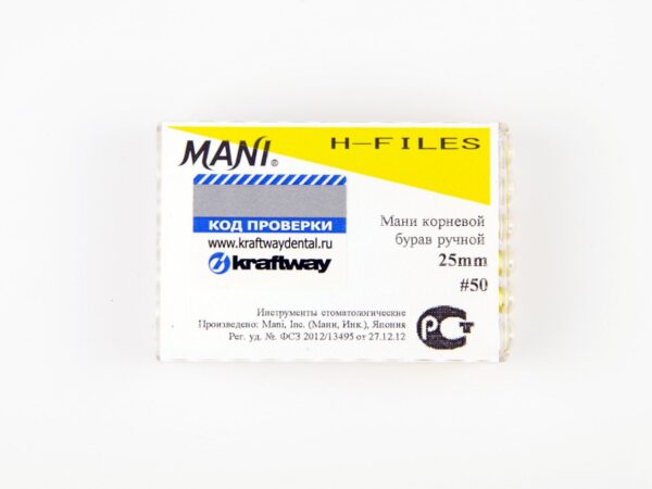 ТЕХНИКА ПРИМЕНЕНИЯ: Обработка канала производится движением инструмента в вертикальном направлении «вверх» — «вниз» (соскабливание). Инструменты типа H-Files обычно используются после обработки канала инструментами типа К-Reamers или K-Files. В пластиковом пенале: 6 штук, Mani H-FILES №50, 25 мм.