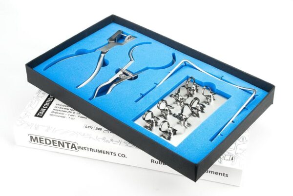 Комплект инструментов и принадлежностей для наложения резиновой завесы Раббер Дам Медента состоит из щипцов для наложения креплений, перфоратора-дырокола, стальных креплений для различных групп зубов, рамки и подставки для креплений. Щипцы для наложения креплений, перфоратор-дырокол, рамка и подставки изготовлены согласно ISO 9001, EN ISO 13485, 93/42/EEC из высококачественной медицинской стали марок AISI 410 и AISI 304 .