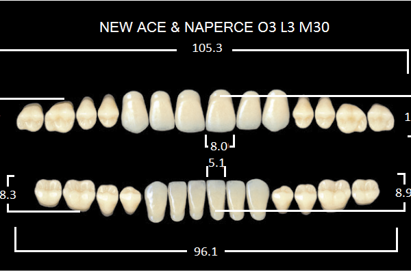 Зубы акриловые двухслойные, полный гарнитур, 28шт. Gloria цвет. A3,5, Фронтальные-O3, боковые-М30
