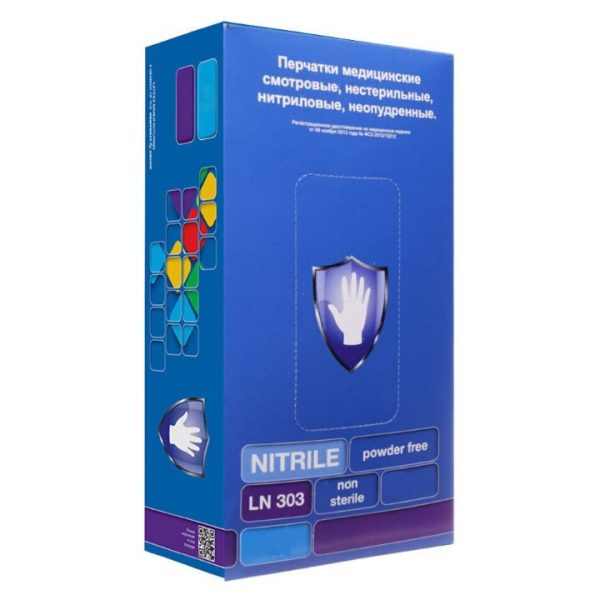 Перчатки смотровые неопудренные нитриловые синие LN 303. Текстурированная поверхность на пальцах, цвет синий, форма плоская, манжета с валиком, гипоаллергенные, нестерильные.