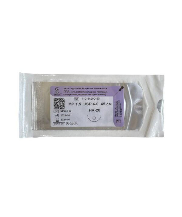 Нить хирургическая 45 см, с колющей иглой (HR) длина 20 мм, USP 4/0. Рассасывающаяся плетёная синтетическая нить (фиолетовая), на основе полигликолевой кислоты (полигидроксиацетиловой — ПГА) с плёночным покрытием из рассасывающегося полимера. Сроки рассасывания: по истечении 14 суток (критический период заживления ран) — сохранение до 50% прочностных свойств; 60-80 суток — полное рассасывание. Область применения: Общая хирургия/ фасции, лигатуры/кожные/ подкожные швы/ гастроэнтерология/ ортопедия /травматология/ педиатрия/ Урология / Офтальмология / Акушерство / Гинекология / Стоматология / Ветеринария. Механизм рассасывания: гидролитический. Особенности: в тканях со слабым кровоснабжением рассасывание может быть замедленным. Преимущества: Нить ПГА прочна, очень удобна в манипуляциях, надежно держит узел. Благодаря покрытию имеет минимальный «пилящий» эффект и капиллярность Эквиваленты: VICRYL Викрил POLYSORB Полисорб DEXON Дексон SAFIL Сафил MARLIN Марлин PGA Resorba ПГА