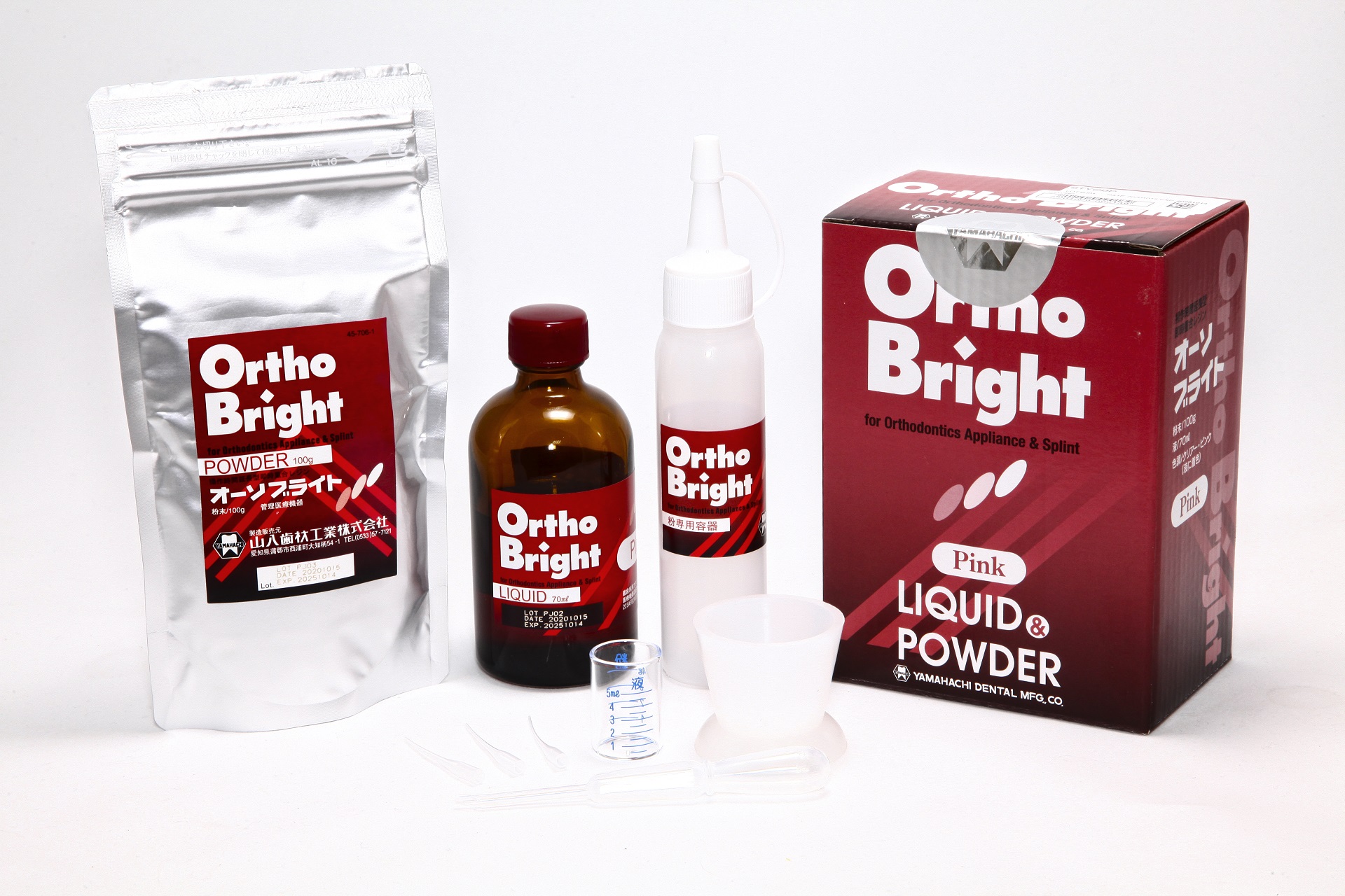 Пластмасса самотвердеющая Ortho Bright Liquid+Powder Clear с длительным временем отвердевания, набор: 100гр+70мл., цвет порошка — розовый, в комлекте силиконовый стаканчик для замешивания, пипетка, 3 насадки для пипетки, мерный стаканчик; время полимеризации 6 мин.. YAMAHACHI (Япония)