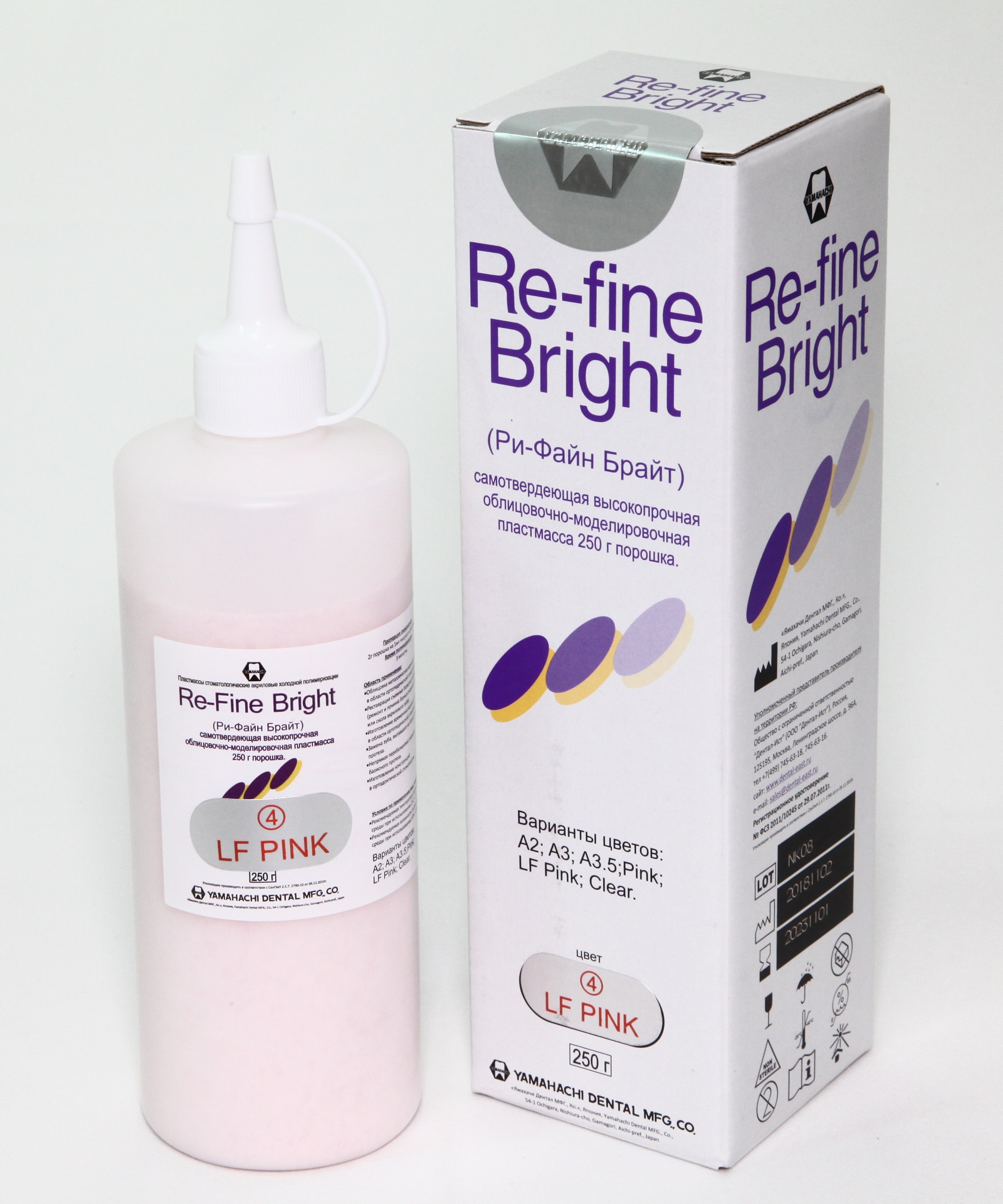 Пластмасса самоотверждаемая Re-Fine Bright, высокопрочная облицовочно-моделировочная пластмасса, цвет LF PINK (розовый с прожилками), порошок 250 г. Время быстрой полимеризации 3 мин.. Используется для реставрации съемных протезов (ремонт и починка базиса съемного протеза или скола акрилового зуба); изготовления временных коронок и мостов; непрямой перебазировки съемного базисного протеза; облицовки металлических каркасов и замков; замены зуба, выпавшего из съемного протеза; изготовления ортодонтических конструкций. YAMAHACHI (Япония).