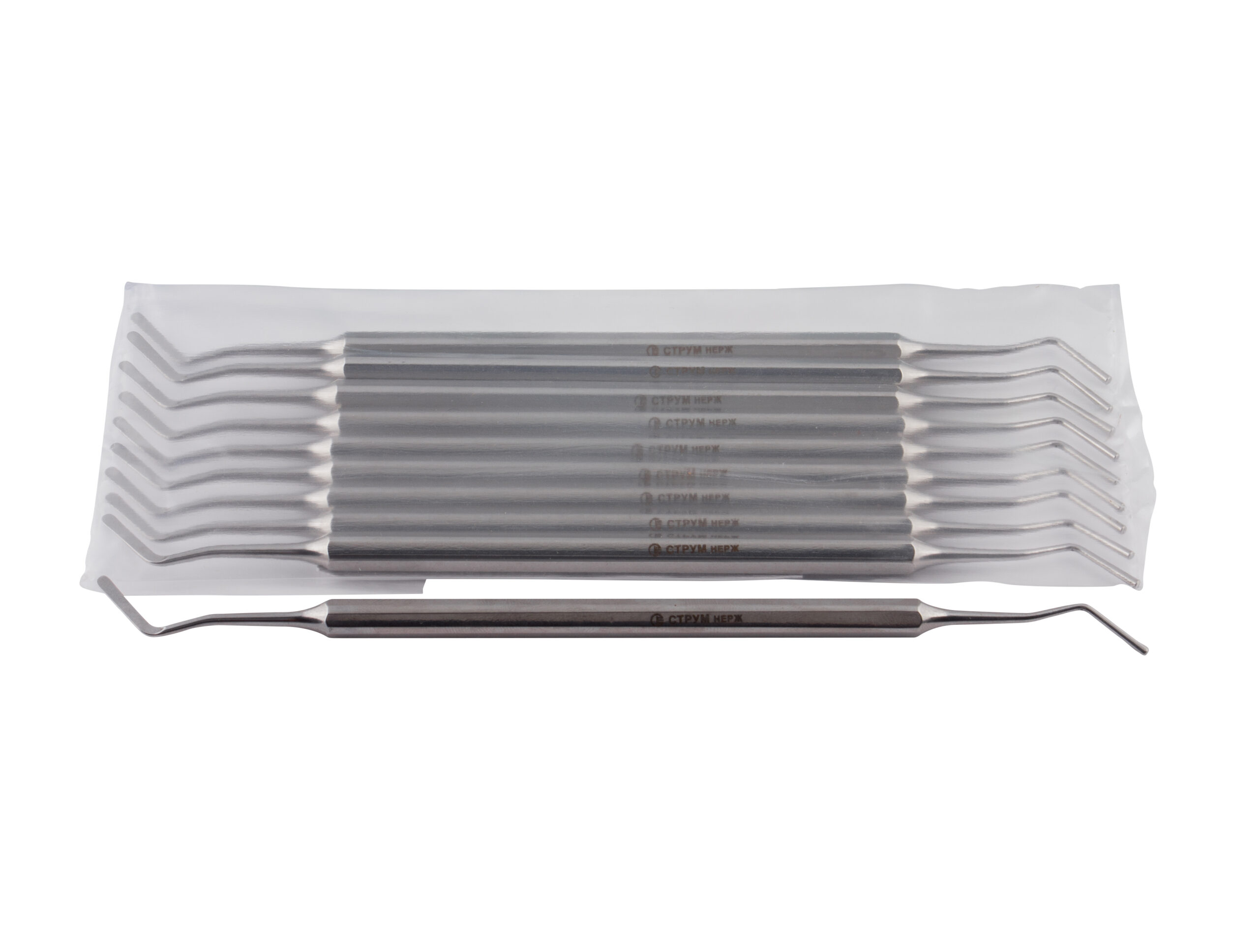 Серповидная гладилка из нержавеющей стали. Назначение: • Внесение прокладок и пломбировочного материала в обработанные кариозные полости • Формирование пломбы