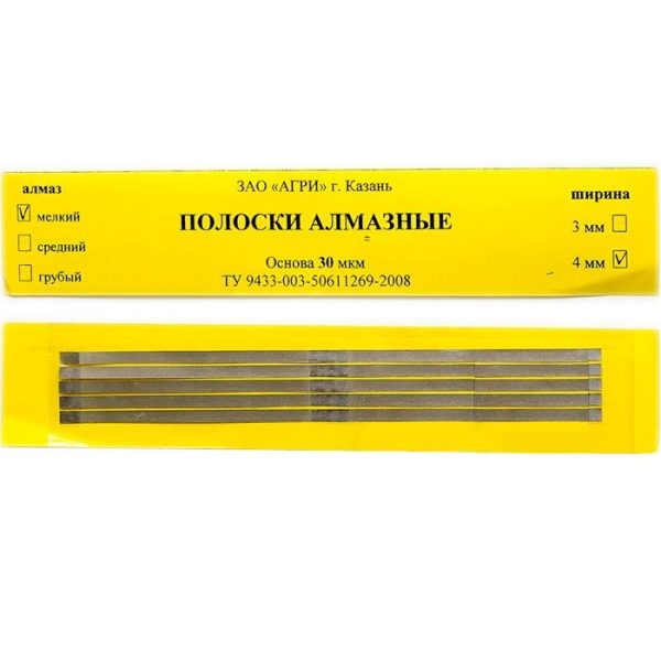 Полоски стоматологические алмазные предназначены для обработки интердентальной поверхности живого зуба, керамического или пластмассового протеза в клинических условиях. Ширина 4 мм, длина 150 мм. В упаковке 5 штук.