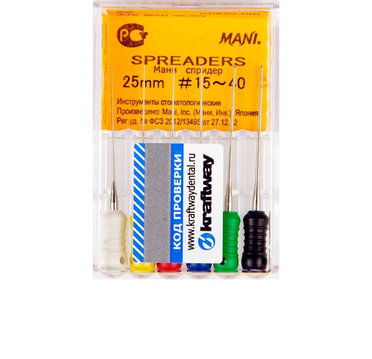 Spreaders MANI — инструмент, применяемый в стоматологии и эндодонтии для очистки и подготовки корневого канала для последующей пломбировки. Данная модель представляет собой усеченный стержень с конусообразным наконечником. Изготовлен из высококачественной стали. Инструмент подходит для обработки канала с использованием техники латеральной конденсации. Последняя представляет собой монтаж штифта из гуттаперчи, его фиксацию и заполнение корневого канала дополнительными штифтами. Spreaders MANI предназначен для ручной обработки, удобная эргономичная ручка из полибутилентерефталата способствует быстрому и комфортному проведению операции. Перед применением необходимо произвести стерилизацию инструмента. Чтобы избежать проглатывания или порчи инструмента при падении, а также повреждений мягких тканей ротовой полости, используйте коффердам.