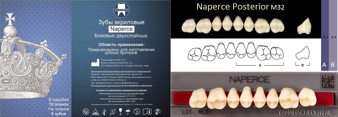Зубы акриловые двухслойные,боковые верхние, 8шт. Naperce Posterior цвет. C1, фасон M32