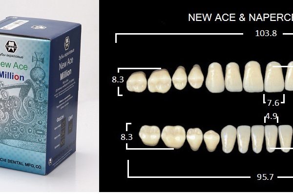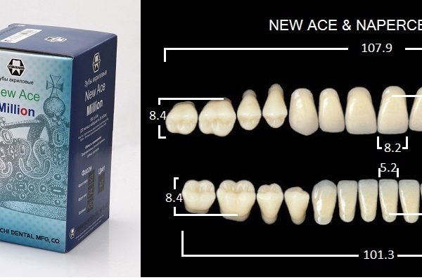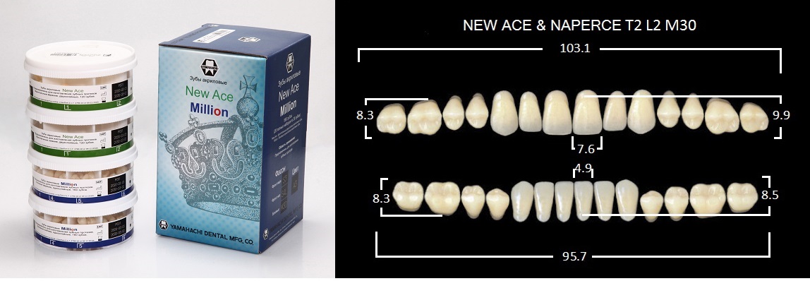 Зубы акриловые, 20 полных гарнитуров в боксе: фронтальные двухслойные New Ace верх фасон T2 — 120 шт.; низ фасон L2 — 120шт.; боковые однослойные Million — фасон M30 — 320шт., цвет A2, Yamahachi (Япония)