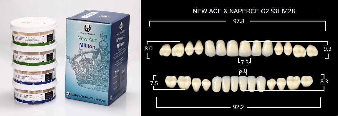Зубы акриловые, 20 полных гарнитуров в боксе: фронтальные двухслойные New Ace верх фасон O2 — 120 шт.; низ фасон S3L — 120шт.; боковые однослойные Million — фасон M28 — 320шт., цвет A3, Yamahachi (Япония)