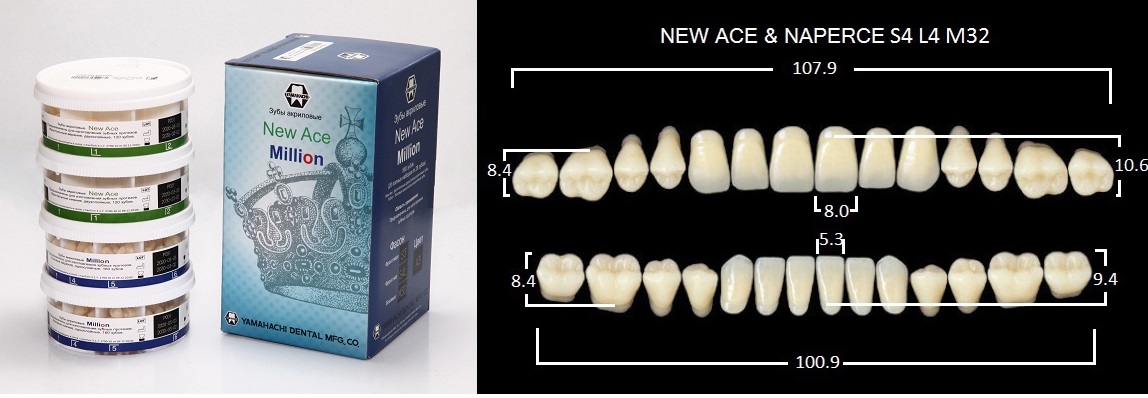 Зубы акриловые, 20 полных гарнитуров в боксе: фронтальные двухслойные New Ace верх фасон T1 — 120 шт.; низ фасон L2 — 120шт.; боковые однослойные Million — фасон M30 — 320шт., цвет A3, Yamahachi (Япония)