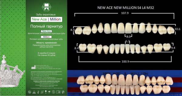 HomeКаталогЗуботехнические материалы и оборудованиеЗубы акриловые Зубы полный гарнитур 28шт., цвет А2,фронтальные двухслойные,верх S4,низ L4, боковые однослойные М32